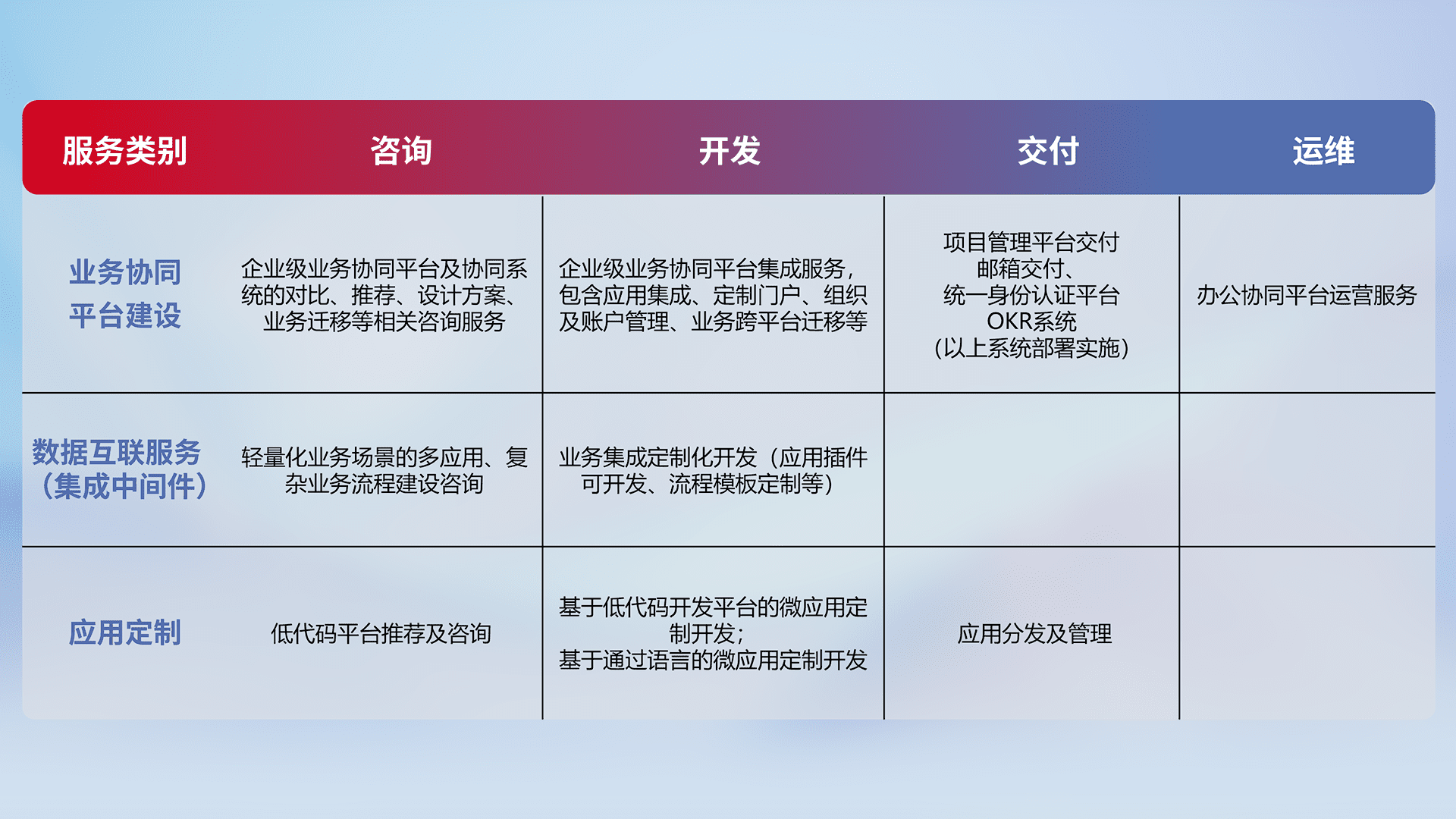 针对钉钉、、、企微、、、、IDaas等平台级产品提供产品的规划、、方案、、、、交付、、、定制化开发等服务,,,实现如统一协同办公、、、智能客户服务、、、混合会议管理、、、、智能数据查询、、、、等业务场景,,实现数字化转型。。