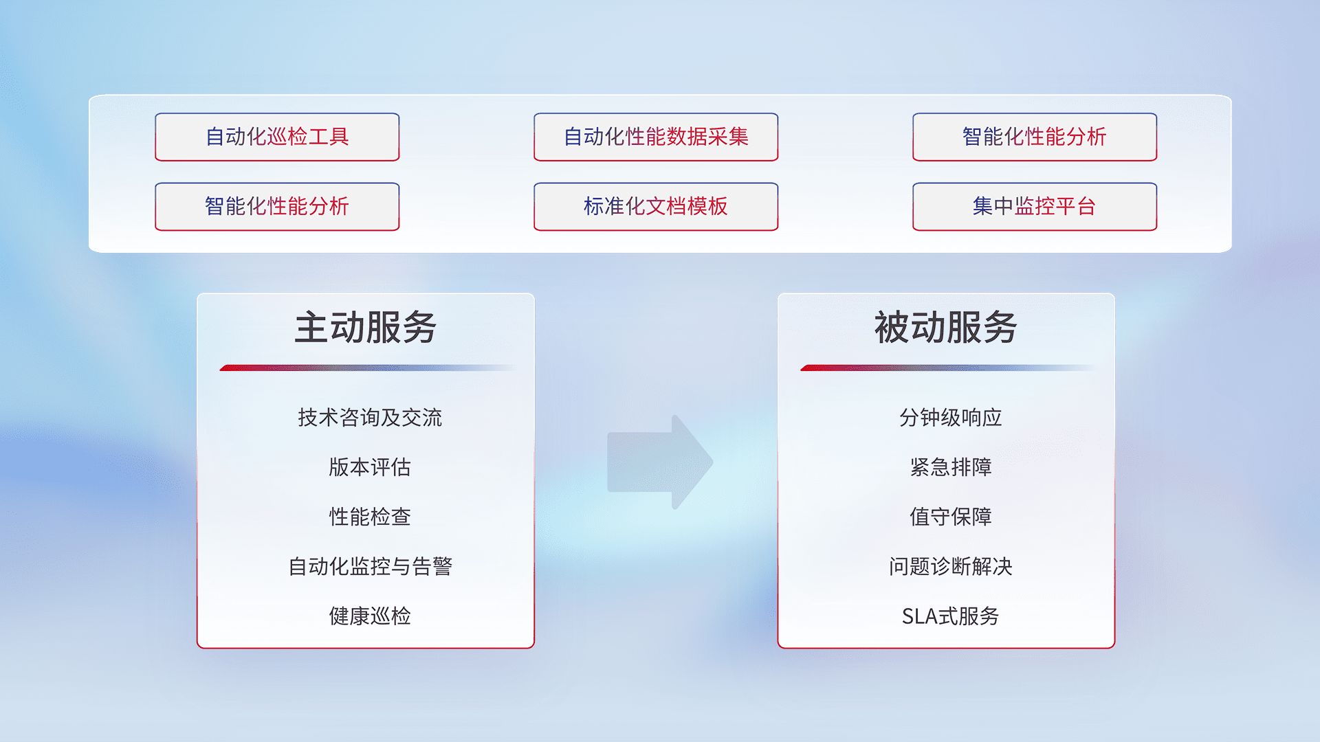 智能化工具和标准化文档,,保障服务质量,,,,提供主动服务(包含技术咨询、、、版本评估、、、性能检查、、自动化监控与告警、、、健康巡检)和被动服务包含(分钟级响应、、、紧急排障、、值守保障、、、、问题诊断解决、、、SLA服务)。。。